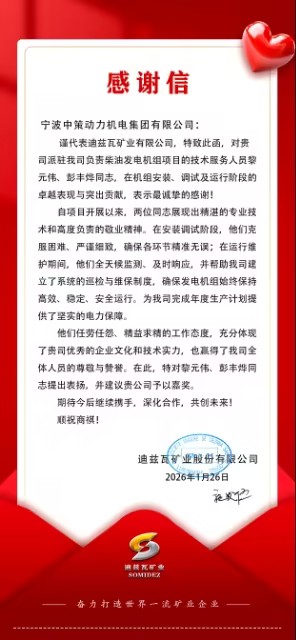 海外服务一线频传佳音,多个项目受到客户好评。刚果(金)迪兹瓦重点项目客户发来感谢信,对公司专业高效的产品与服务给予高度认可,对现场调试服务人员的敬业精神致以诚挚谢意。感谢信中提到,我方保障的发电机组始终保持高效、稳定、安全、持续运行,为客户顺利完成年度生产计划提供了坚实的电力保障,进一步巩固了双方深度合作的信任基础。